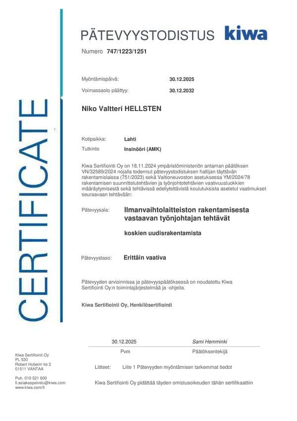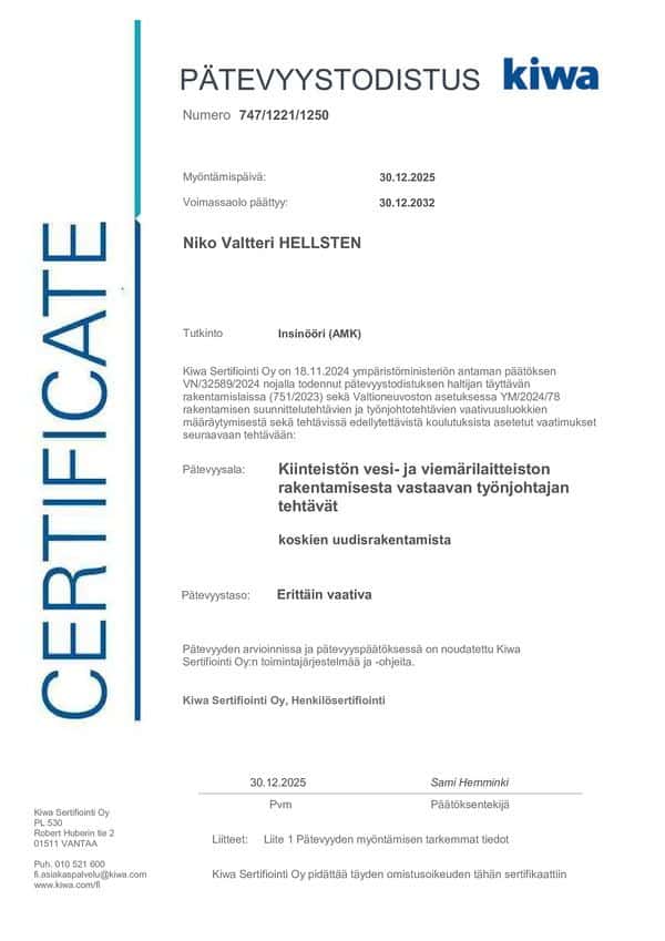 Yrityksellä on KVV- ja IV – työnjohtajan luvat sekä kaukolämpö urakointioikeudet.